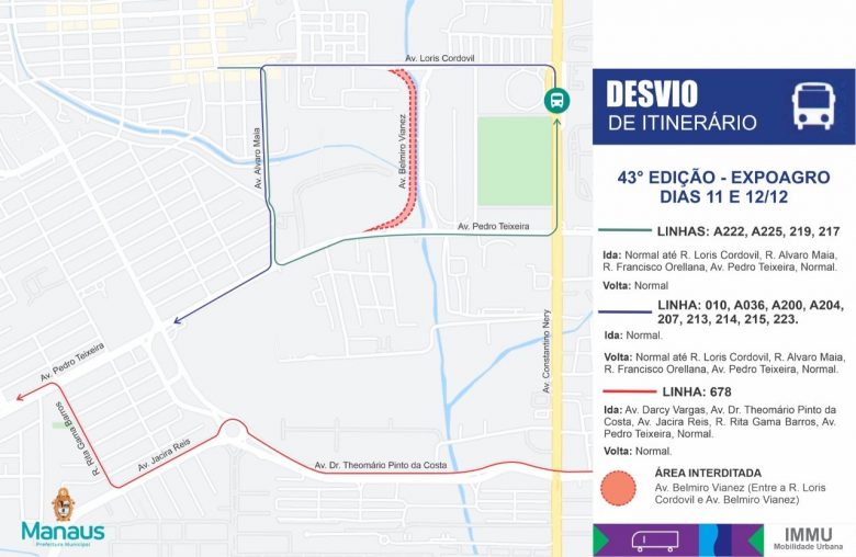 A Prefeitura de Manaus, por meio do Instituto Municipal de Mobilidade urbana (IMMU), irá alterar o itinerário de 14 linhas de ônibus do sistema de transporte coletivo, por conta da 43ª Feira de Exposição Agropecuária (Expoagro), que será realizada na área do kartódromo de Manaus, zona Centro-Oeste. As interdições acontecerão a partir deste sábado 11/12.