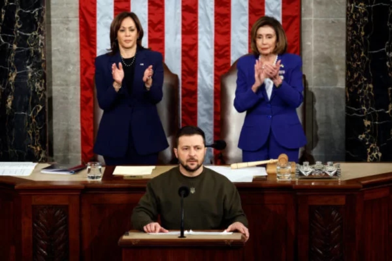 Durante o discurso, Zelensky foi aplaudido de pé diversas vezes pelos congressistas presentes. Ao final, ele entregou uma bandeira com as cores da Ucrânia para para a vice-presidente americana, Kamala Harris e a presidente da Câmara, Nancy Pelosi.
